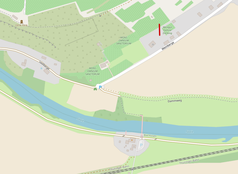 In größerer Zahl bestehen Parkmöglichkeiten am Kloster Schulpforta. Um diese zu erreichen, bleiben Sie in Almrich auf der B 87 bis nach Schulpforte. An der scharfen Linkskurve biegen Sie rechts ab (Richtung “Fischhaus”) und können Ihr Fahrzeug an der Straße bis zu den Bahnschranken parken. Dann erreiche Sie uns zu Fuß (10 Minuten) über die Bahnschranke und anschließend über die Fußgängerbrücke über die Saale. Haben Sie den asphaltierten Hauptweg erreicht, wenden Sie sich nach rechts und finden unseren Weinberg nach ca. 150 Metern.